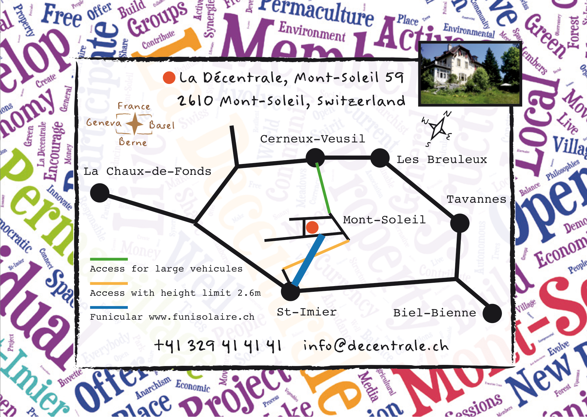 The Décentrale is located in the heart of the mountain top hamlet Mont-Soleil at 1200m altitude. Mont-Soleil is well know for it’s renewable energy installation and is part the Chasseral Nature Park and the Swiss Energy Park. It provides research, innovation and demonstration facilities for wind and solar power and attracts a significant amount of visitors. Mont-Soleil is reachable by Funiculaire cable railway from St-imier, witch is located 400m below in the valley. This makes the Décentrale conveniently reachable via a two minutes walk from public transportation, see https://wiki.synergiehub.ch/sbb-cff for details.